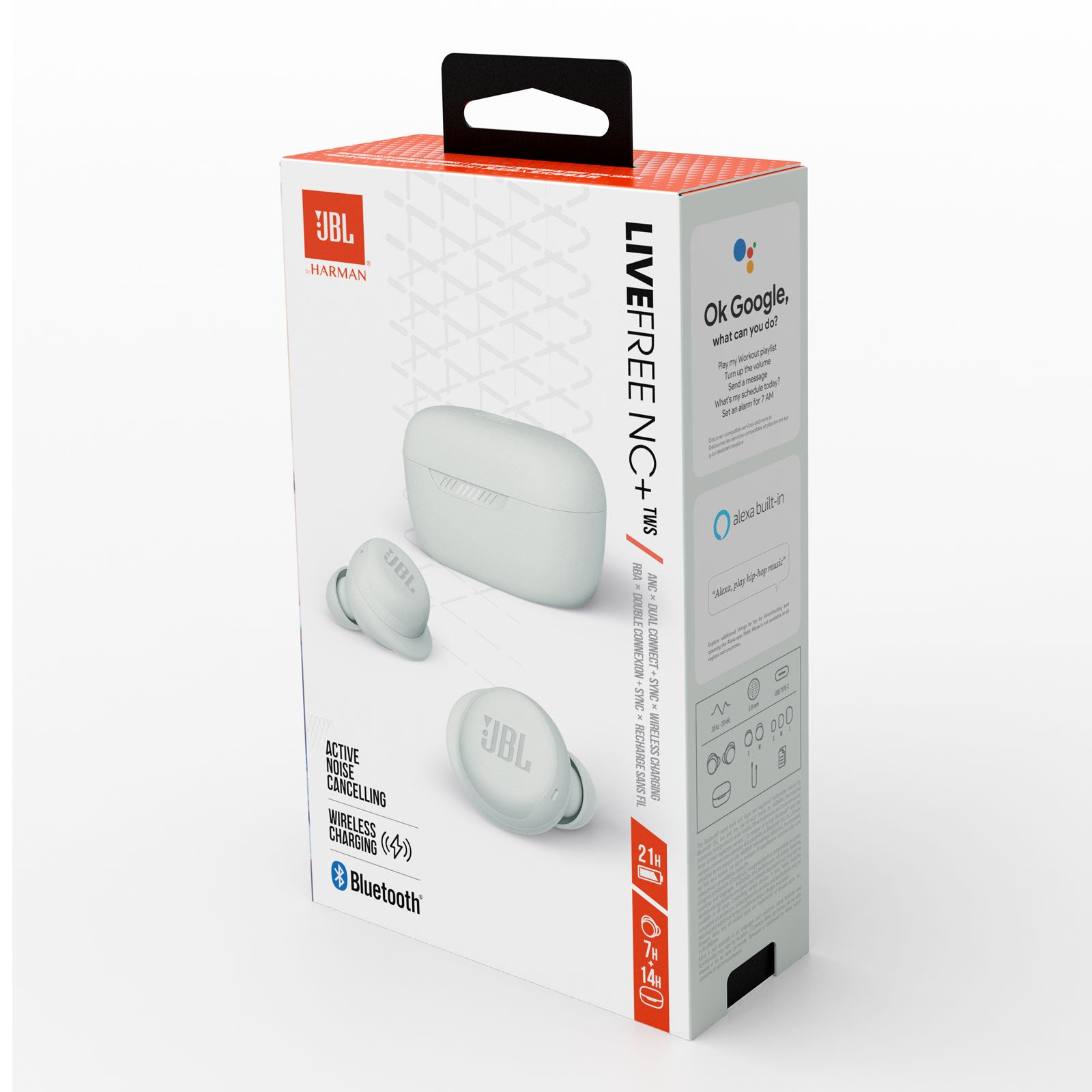 Take on the world, with style. JBL Live Free NC+ TWS earbuds deliver JBL Signature Sound with supreme comfort. Stay in the groove all day long without noise or any distractions thanks to Active Noise Cancelling, while TalkThru and Ambient Aware keep you in touch with your friends and surroundings. Up to 21 hours of battery life and in-case wireless charging gives you seamless, convenient ease of use, and Dual Connect + Sync means you can start listening immediately, with either earphone or both. With your choice of Voice Assistant, perfect calls, and intuitive controls right at your fingertips, you'll never need to stop the music. Water and sweat proof, the JBL Live Free NC+ TWS won't let you down no matter your activity or the weather conditions. So you can live Free.