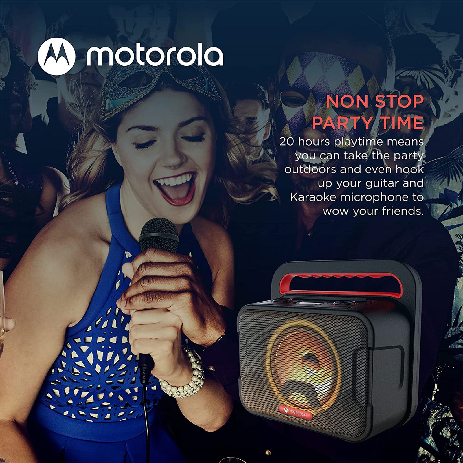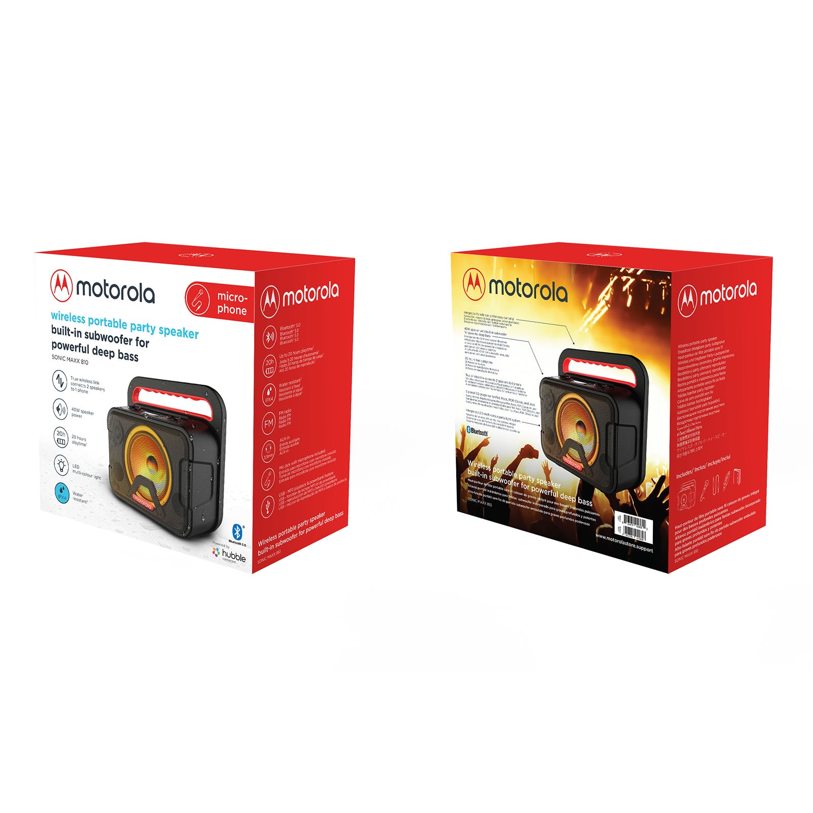 Make every occasion a party with this 810 Sonix Maxx speaker from the fantastic brand Motorola. The speaker is even suitable for a pool party, because this speaker is waterproof (IPX4)! This party speaker gives an impressive sound with which you can enjoy your favourite music until the late hours. With the Sonic Maxx 810 you can listen to your favourite playlist for up to 11 hours with LED light that moves along with the beat. Want to party on even longer, without worrying about battery life? Then you can also use the speaker without LED and party on for up to 20 hours! Connect the speaker to your phone or tablet and play songs via Bluetooth 5.0. This wireless speaker is easy to take with you wherever you go because it is equipped with a lever.